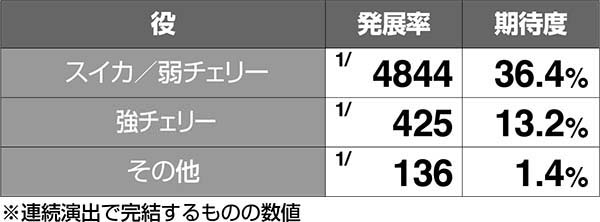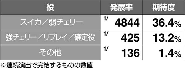 設定1のスイカは約2%、弱チェリーは約3%で連続演出発展と発展率は低いが、発展すれば激アツ。