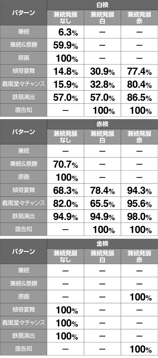 襖のみ・襖+キャラ・襖+兼続発展演出の3パターンがあり、組み合わせに応じて期待度が変化。