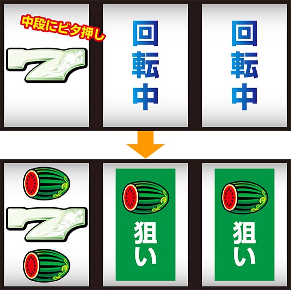 スイカを揃えたあとは左リールに白7を避けて順押しフリー打ちで消化すればOK。