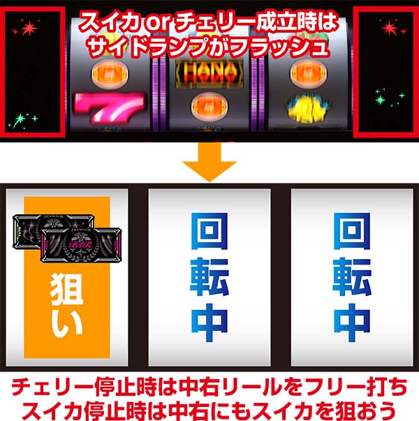 チェリーorスイカ成立時はサイドランプがフラッシュするので、通常時と同様の小役狙いをおこなおう。