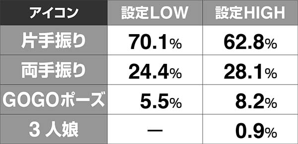 ・GOGOポーズ…設定HIGHほど出現しやすい(両手振りよりも設定差大!?)