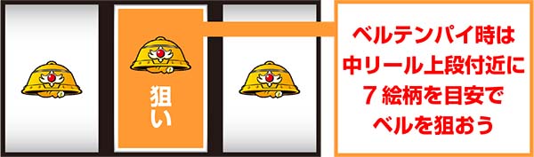 左リールにベルが停止した時は、ハサミ打ちで右リールをフリー打ち、ベルがテンパイした場合のみ中リールにベルを狙おう。