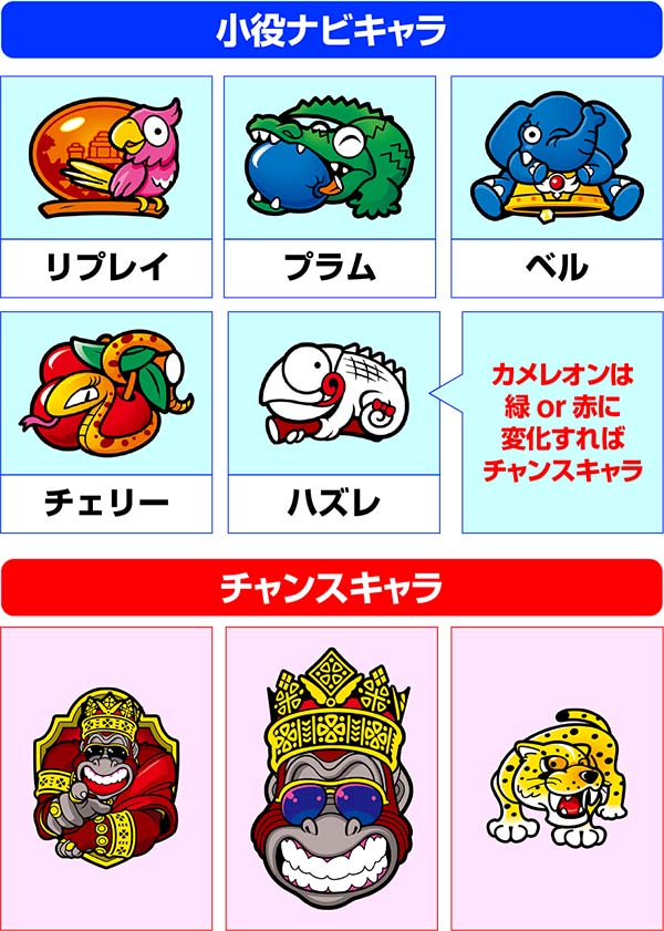 テトラリールによる多彩な演出に加え、おなじみのナビ矛盾がさらに進化した「ジャングルマスターコングダム」がボーナス+RTで登場。 ボーナスは最大300枚のBIGとRT貫通式のREGがあり、BIG後は20GのRT・ナイトモードに突入。滞在中に昇格リプレイを引ければ、100Gor999G継続のロングRT・ジャングルタイムに移行する。ボーナスとRTの連鎖からコング級の出玉を生み出すことも可能だ。 |