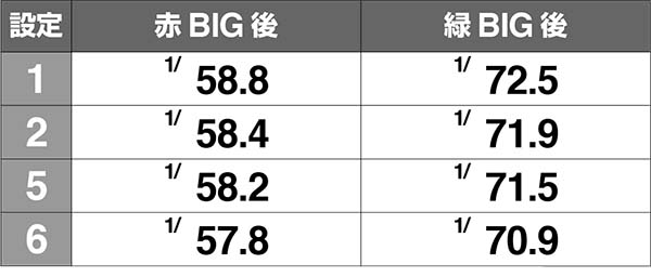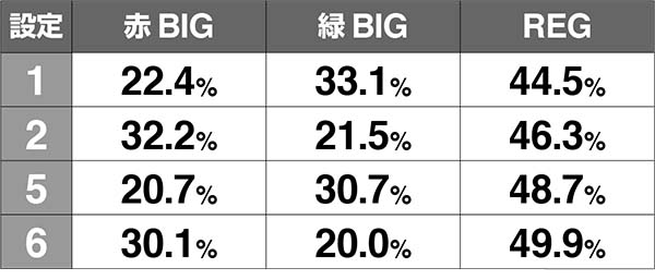 奇数設定は緑BIG、偶数設定なら赤BIGの比率が高い。