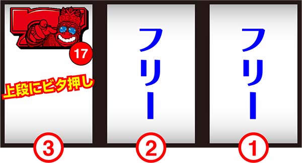 逆押しで中右リールをフリー打ちし、左リール上段に17番の赤7(上がチェリーの赤7)をビタ押しすればOK。