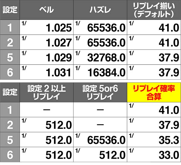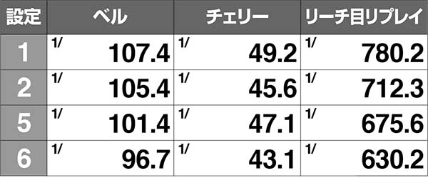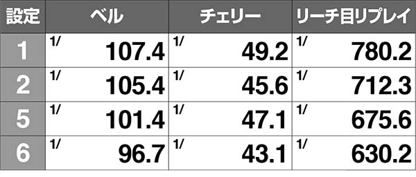 チェリー確率は偶数かつ高設定が、ベルとリーチ目リプレイ確率は高設定ほど高い。