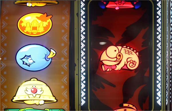 テトラリールにカメレオン(赤)かコングが止まった状態で全リール停止後にチャンスボタンを押すと、発展だ!の掛け声とともに1G限定のテトラリールの目押しモードに変化。