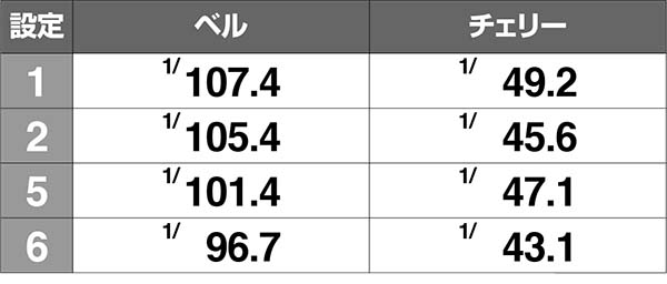 ベルは高設定ほど、チェリーは偶数設定が優遇されている。