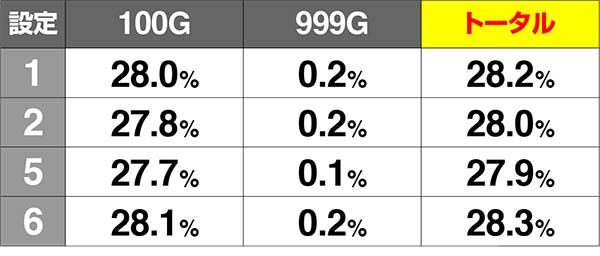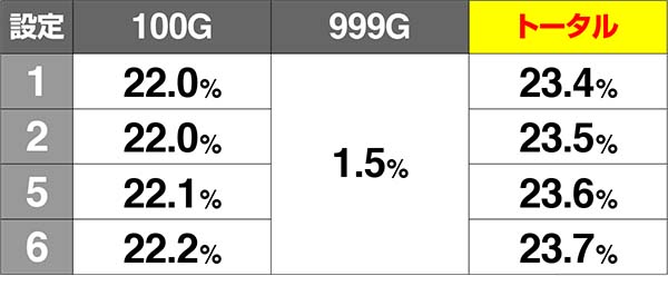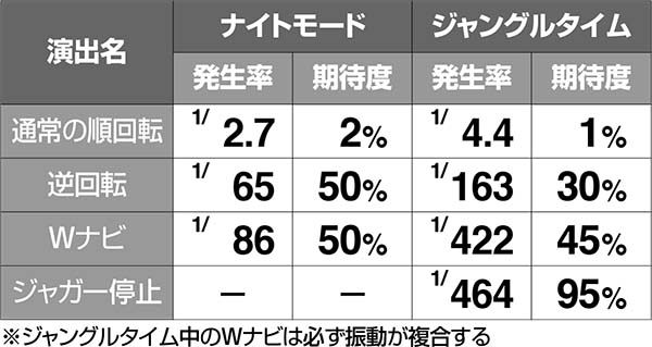 最大20G継続するナイトモードからジャングルタイム(JT)への移行率は、BIGと設定で異なる。