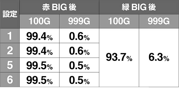 緑BIG後でも999Gの割合はそこまで高くないが、赤BIG後の約10倍移行しやすい。