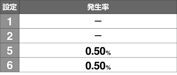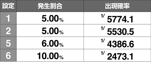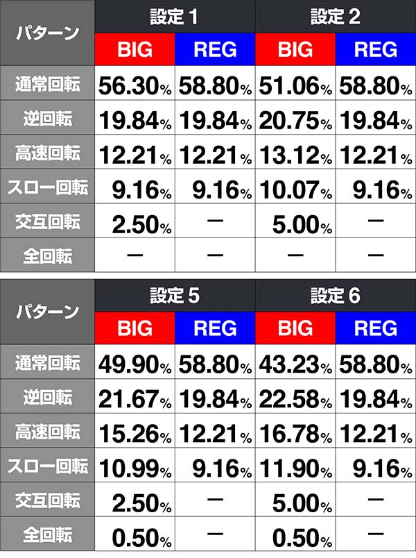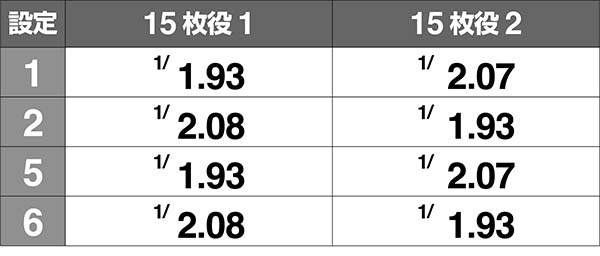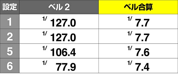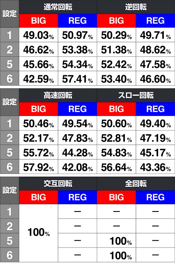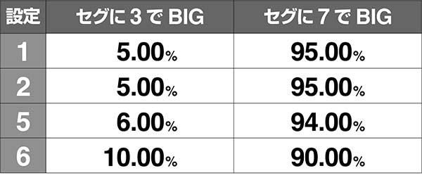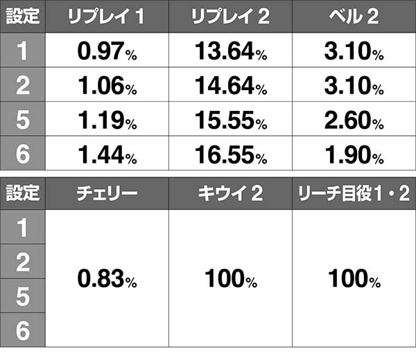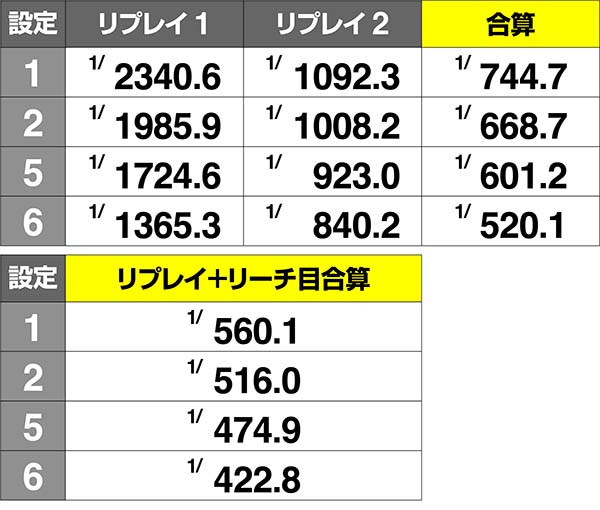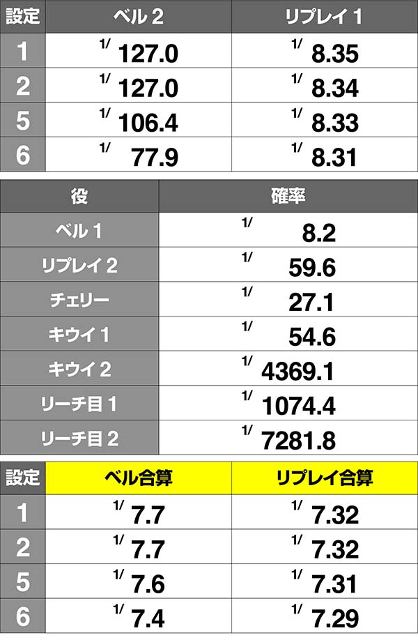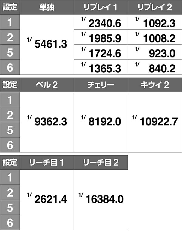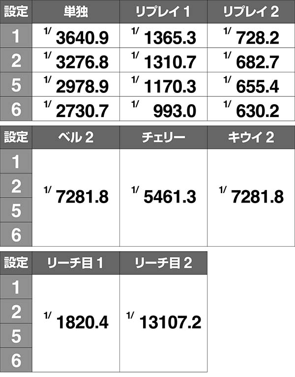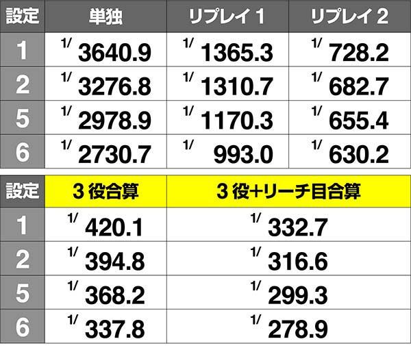 高設定ほど、単独(BIGのみ)、リプレイ1、リプレイ2のボーナス同時当選確率が高い。