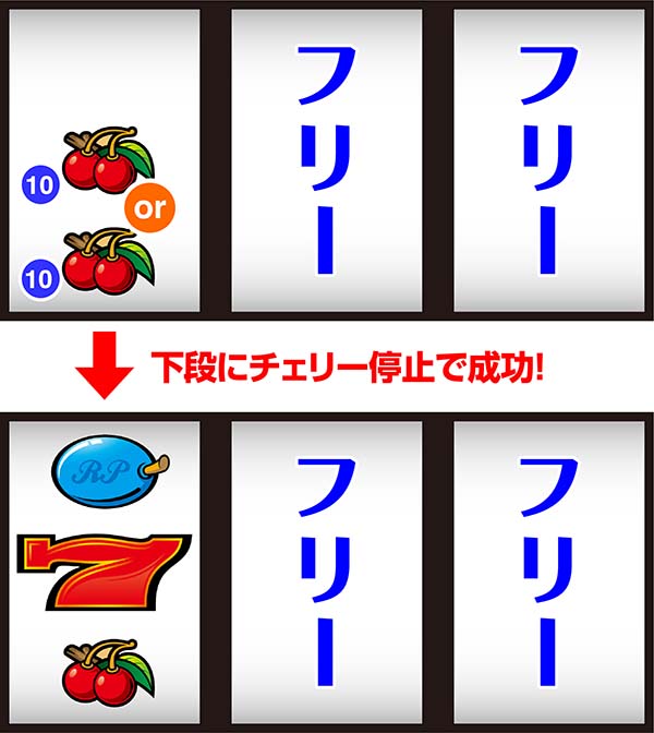 左リール中〜下段に10番のチェリーを狙う(赤7と白7に挟まれたチェリー)。