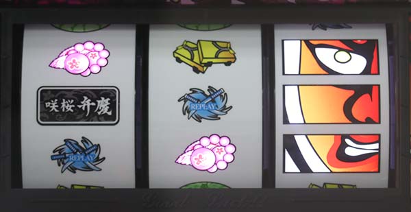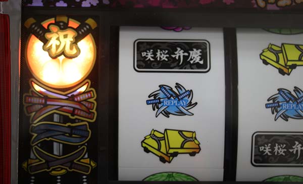 ボーナス内部中はリプレイ確率がアップしており、リプレイが連続するほど刀ランプの点灯数が増える。
