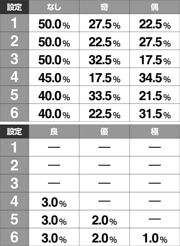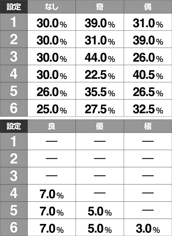 | 大当り確率 | 1/119.8〜1/94.9(通常時) |