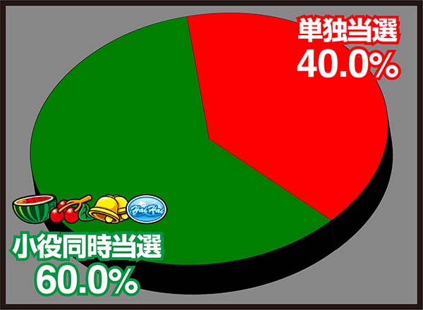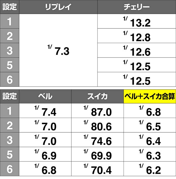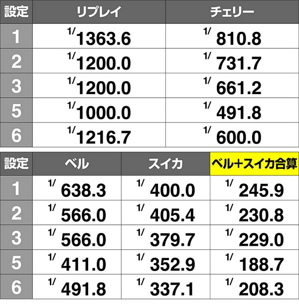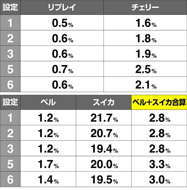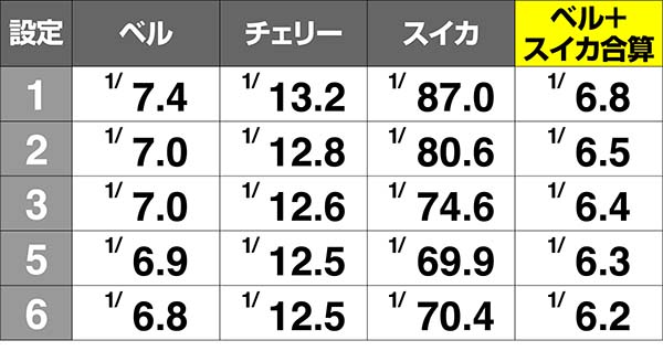 低設定の期待度が若干高いが、スイカは高設定で出現しやすいので実質ボーナス確率は高設定の方が高い。