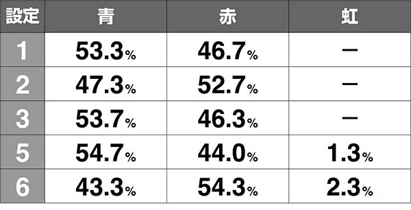 青は奇数設定、赤は偶数設定を示唆しており、虹に光れば設定5以上濃厚だ。
