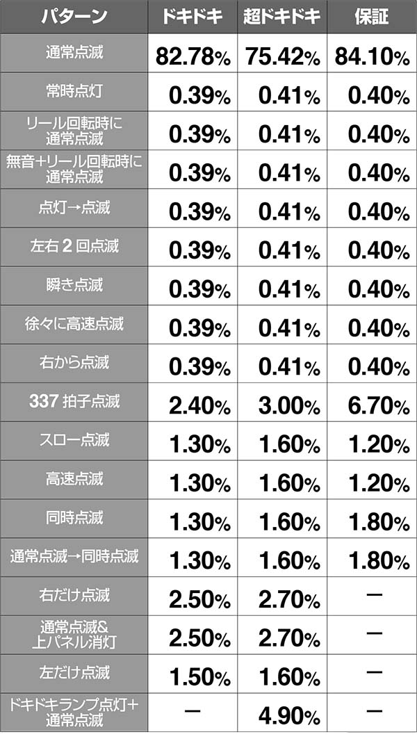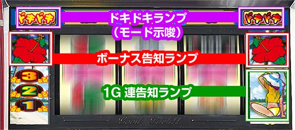 ボーナス告知ランプが通常以外のパターンならBIG確定+モード示唆、告知時にドキドキランプが点灯すれば超ドキドキモード。