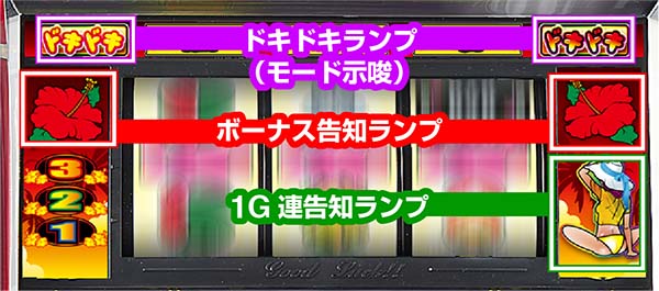 ボーナス告知ランプが通常以外のパターンならBIG確定+モード示唆、告知時にドキドキランプが点滅すれば超ドキドキモード。