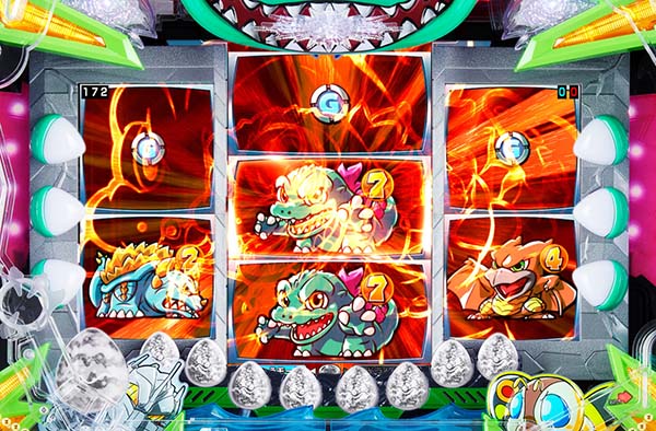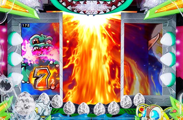 図柄部分の背景に炎が出現時にリーチ成立で大チャンス。