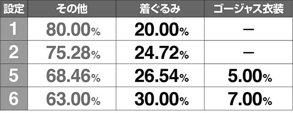 ラウンド開始時のくるみ&くる子の衣装で設定が示唆され、着ぐるみは若干ではあるが高設定ほど出やすい。