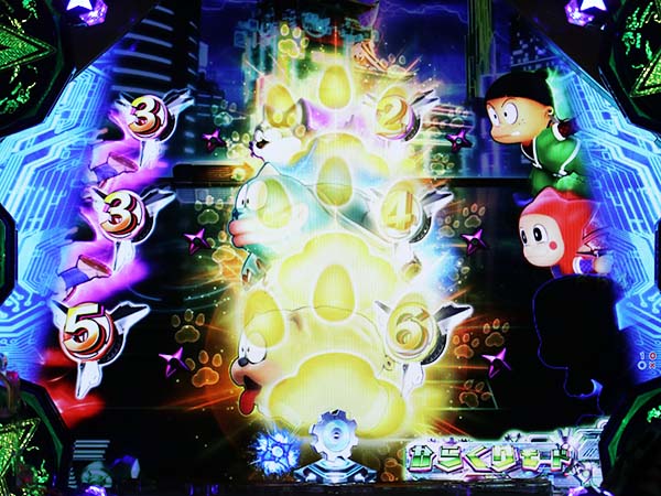 中央のシングルライン時に図柄が分身すれば発展。