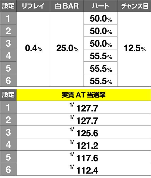 小役確率、AT当選率ともに高設定ほど高いので、小役ごとの実質AT確率にも設定差がある。