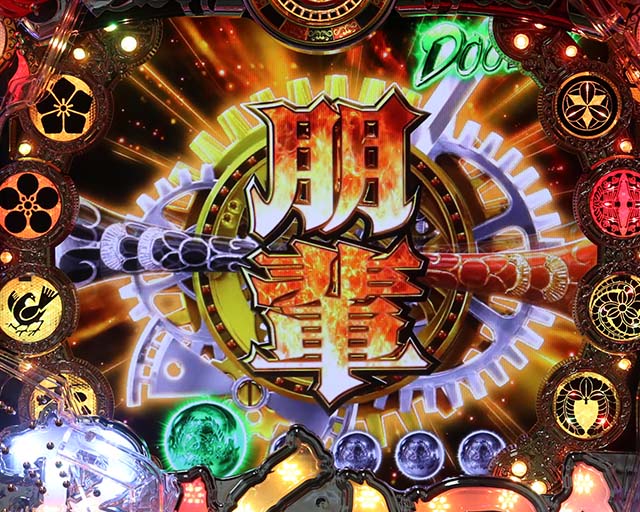 ハズレ目停止後に左右のギミックが動くと発展し、ボタンを長押しすると家紋が点灯。