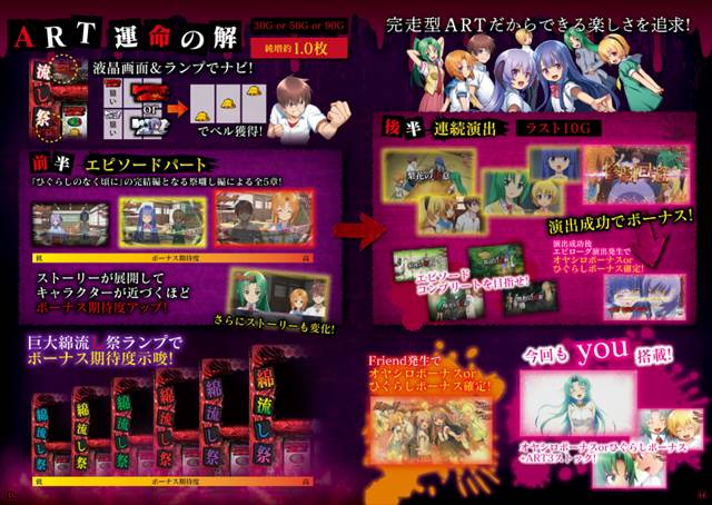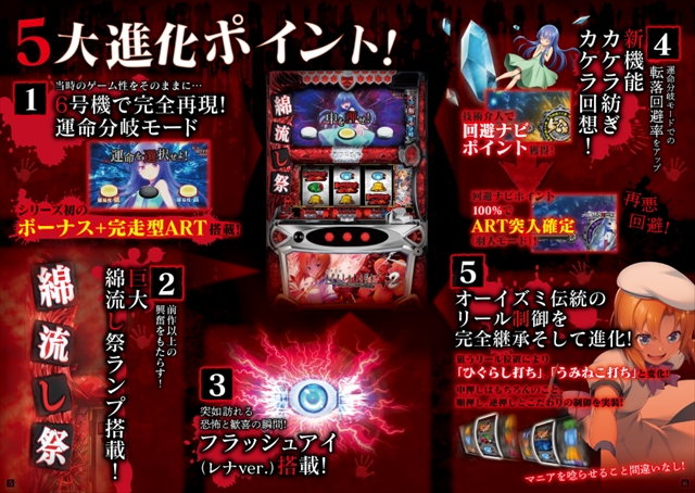 5号機シーンでの技術介入を浸透させ、多くのユーザーを虜にした『パチスロ ひぐらしのなく頃に祭』のゲーム性や技術介入、リール制御などを完全再現していることが本機最大の特徴となる。