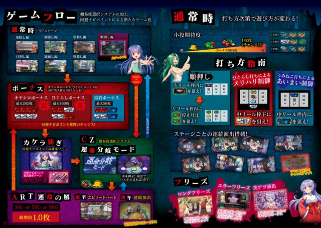 中押しで全役をフォローできるリール制御はそのままに、『パチスロ うみねこのなく頃に』のリール制御も採用したことにより、中リール枠下白7狙いの「ひぐらし打ち」、中リール青7狙いの「ひぐらし打ち」と、遊技性の幅が広がった点も本機の魅力の1つとなっている。