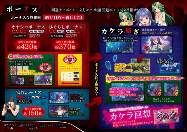 さらに今作では、「運命分岐モード」中の転落回避ナビ発生率に関わる「回避ナビポイント」を新搭載し、ボーナス中のビタ押し成功時やボーナス終了後に突入する「カケラ紡ぎ」で回避ナビポイントを獲得。「富竹ボーナス」後でも回避ナビポイントを100%獲得できればART突入確定となる。
