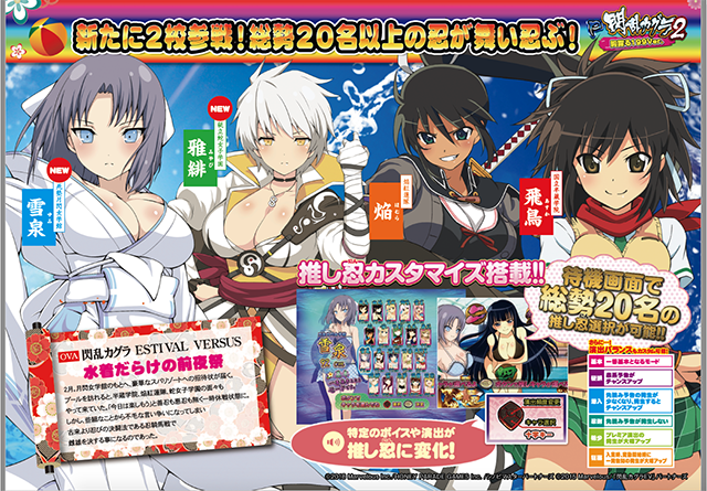 本機はOVA「閃乱カグラ ESTIVAL VERSUS」で人気NO.1を誇る雪泉をはじめ、多数の新キャラが参戦。待機画面で総勢20名の推し忍を選ぶことができる。