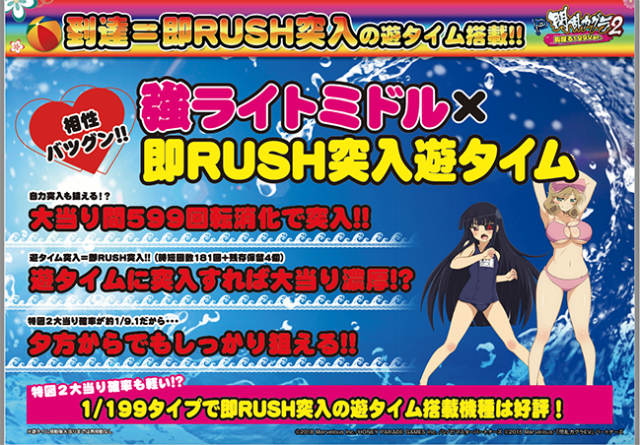1種2種混合のライトミドルスペックで登場する本機は、低確率599回転で突入する遊タイム(電サポ181回+残存保留4個)を搭載。特図2の大当り確率が約1/9.1ということから、遊タイム突入で大当りが濃厚になる。