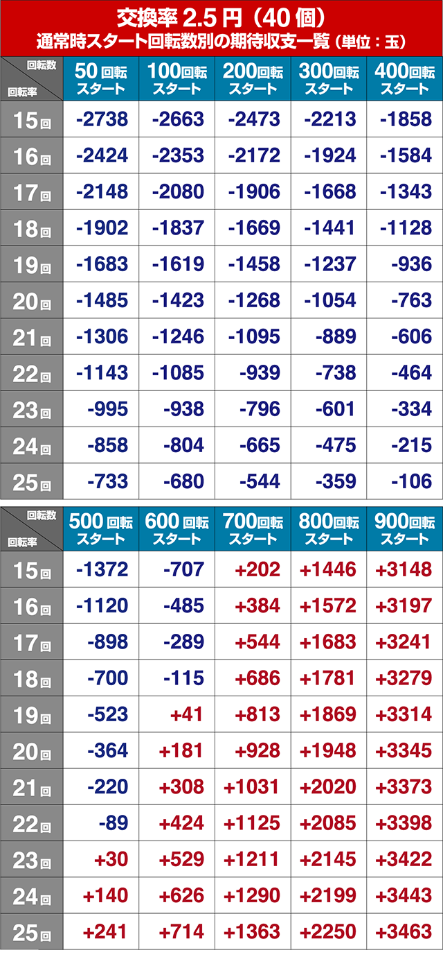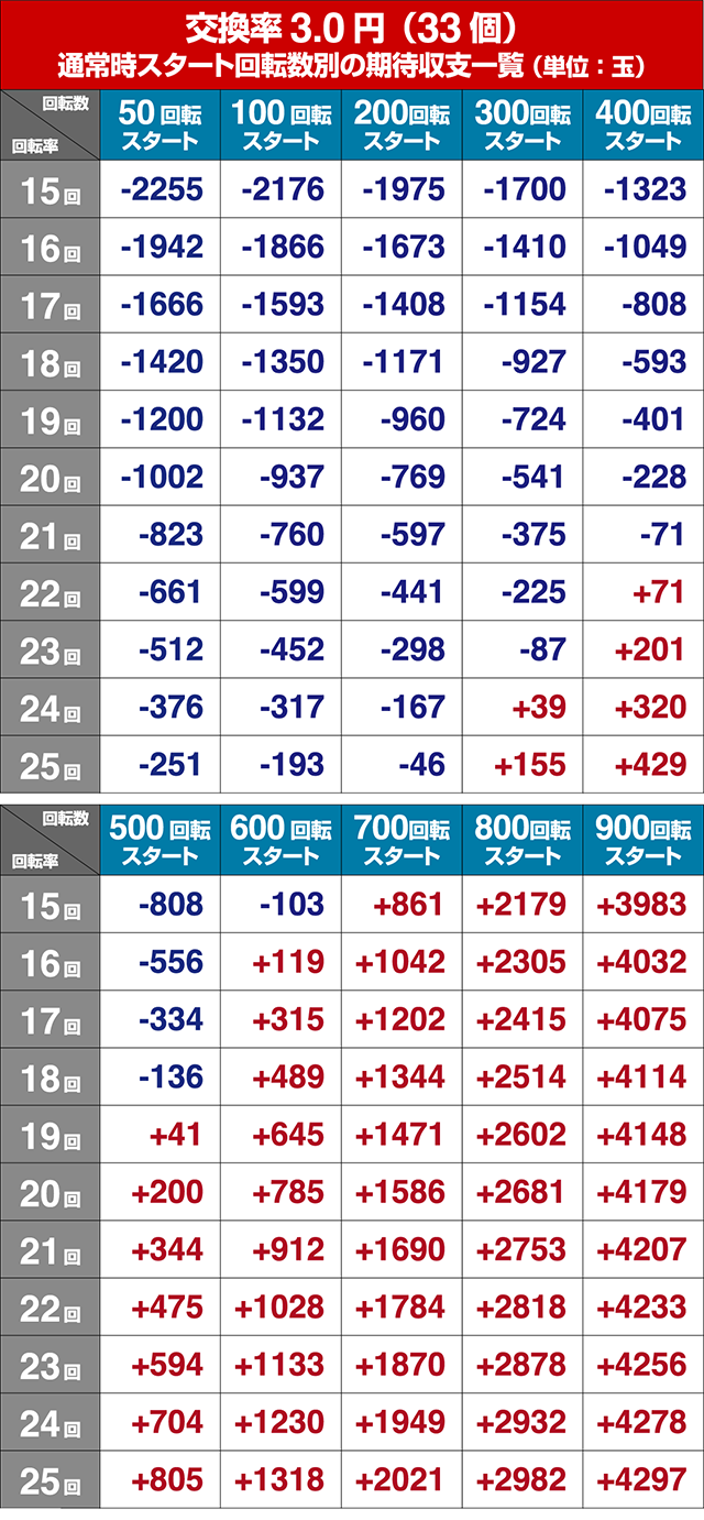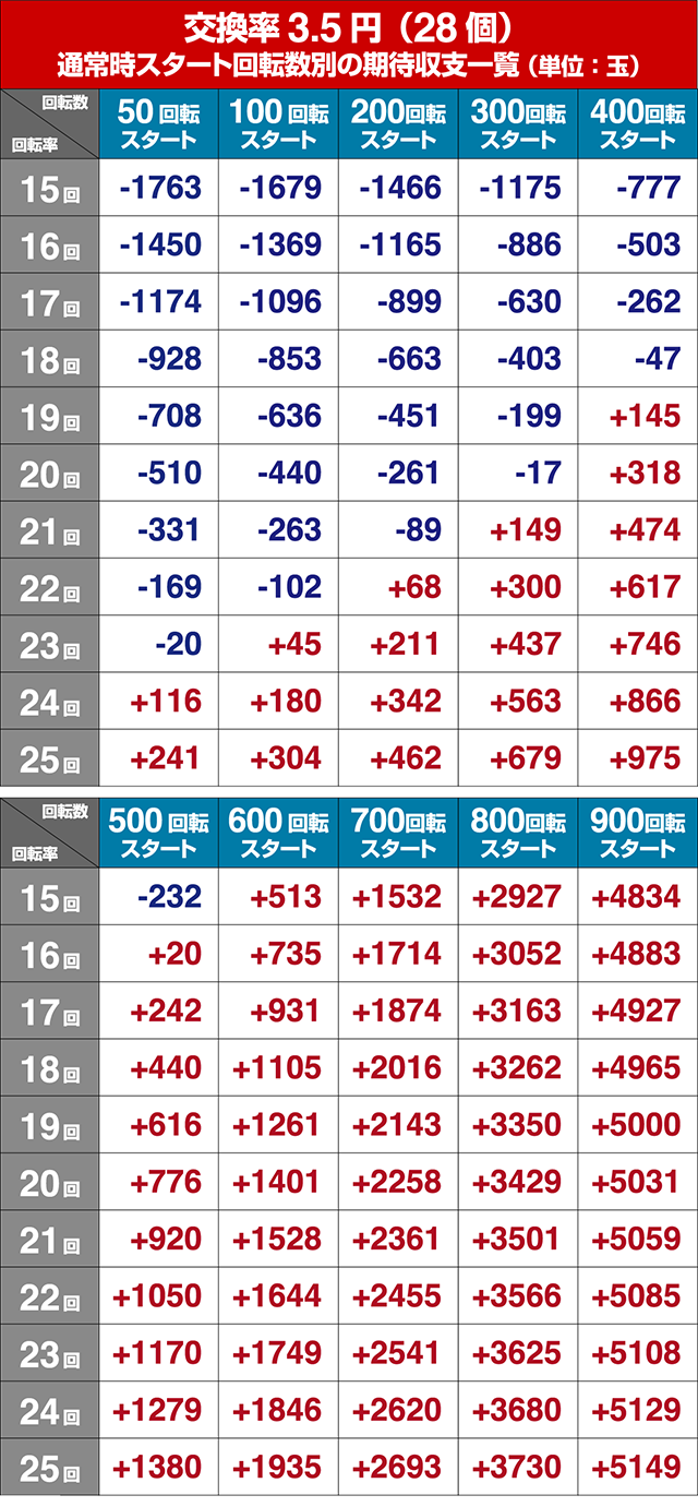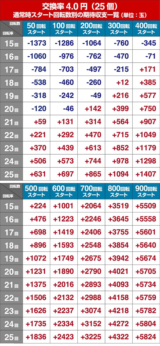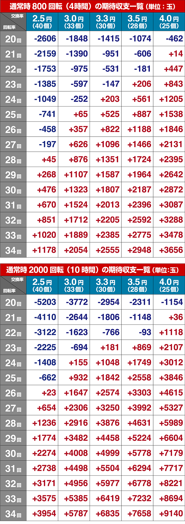 ※回転数あたりのプラス個数は交換後の1玉4円換算での値