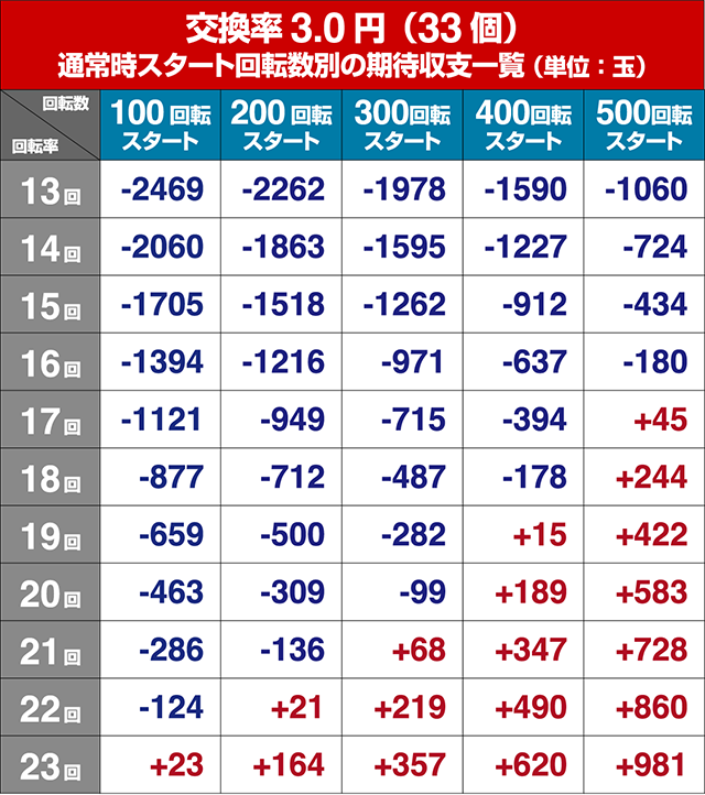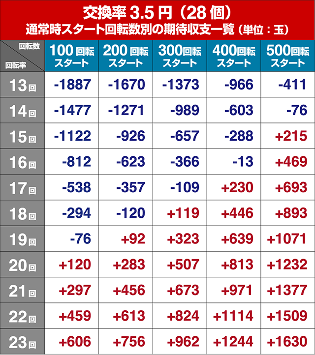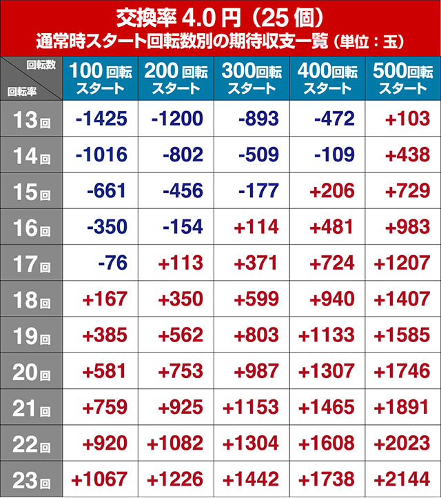 ※回転数あたりのプラス個数は交換後の1玉4円換算での値