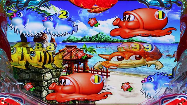 モード共通で、画面や枠が震えるじんべぇチェンジが発生すると、泡が魚群に、ハズレ目がレッツマンボウに変化するなど残念な展開がアツい展開に変化!