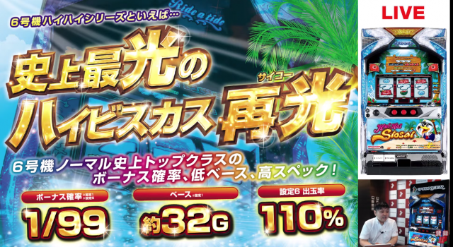 6号機『ハイハイシオサイ』といえば、とにかく軽い、当たりやすいスペックが特徴的だった。第2弾となる本機でも前作同様に、1/99〜1/83(設定1〜6)という驚異的な初当り確率を実現。