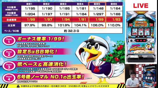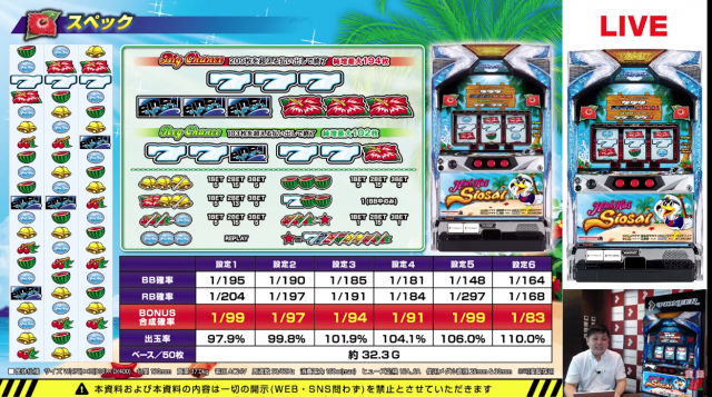 なお設定5は合算こそ設定1と同じだが、BIG確率が全設定でもっとも高くなる。BIGに偏り、爆発力のある設定5が存在することで、設定推測の幅も広がる仕様だ。