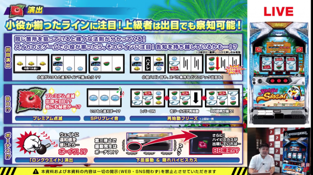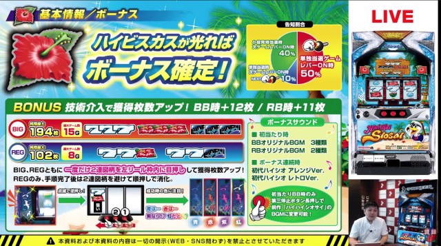 ハイビスカスが光ればボーナス確定という、シンプルなゲーム性のノーマルタイプで登場。簡単な技術介入を行うことで、BIGは最大194枚、REGは最大102枚を獲得できる。さらに技術介入時のランプ色には、設定示唆演出も!?