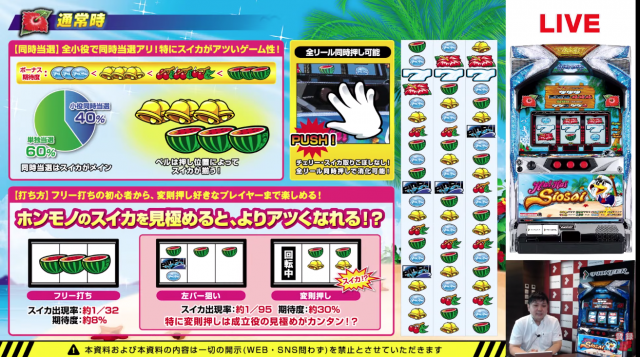 全ボタン同時押し可能、フリー打ちでも小役の取りこぼしナシなど、初心者でも楽しめる配列・制御なのも嬉しい。さらに目押し上級者はしっかりとスイカを狙うことで、スイカ成立時によりアツく楽しむことができる。
