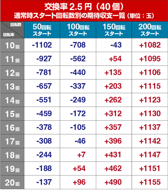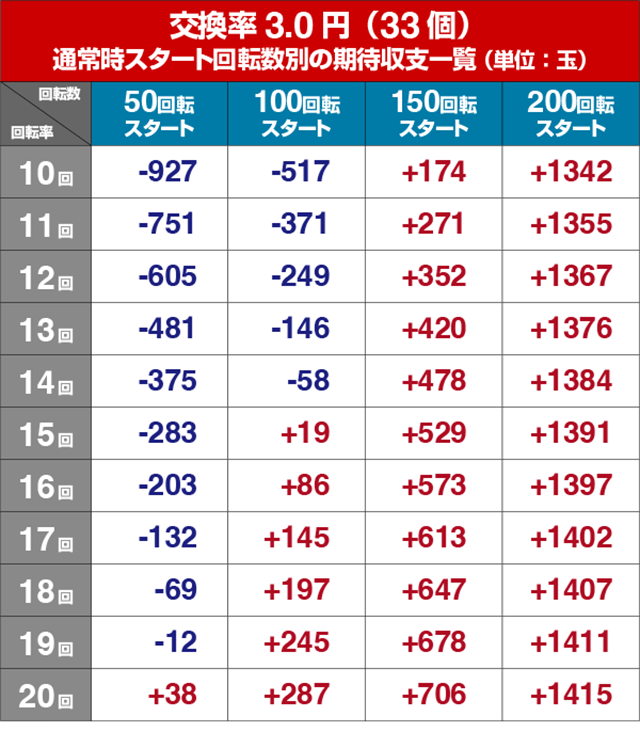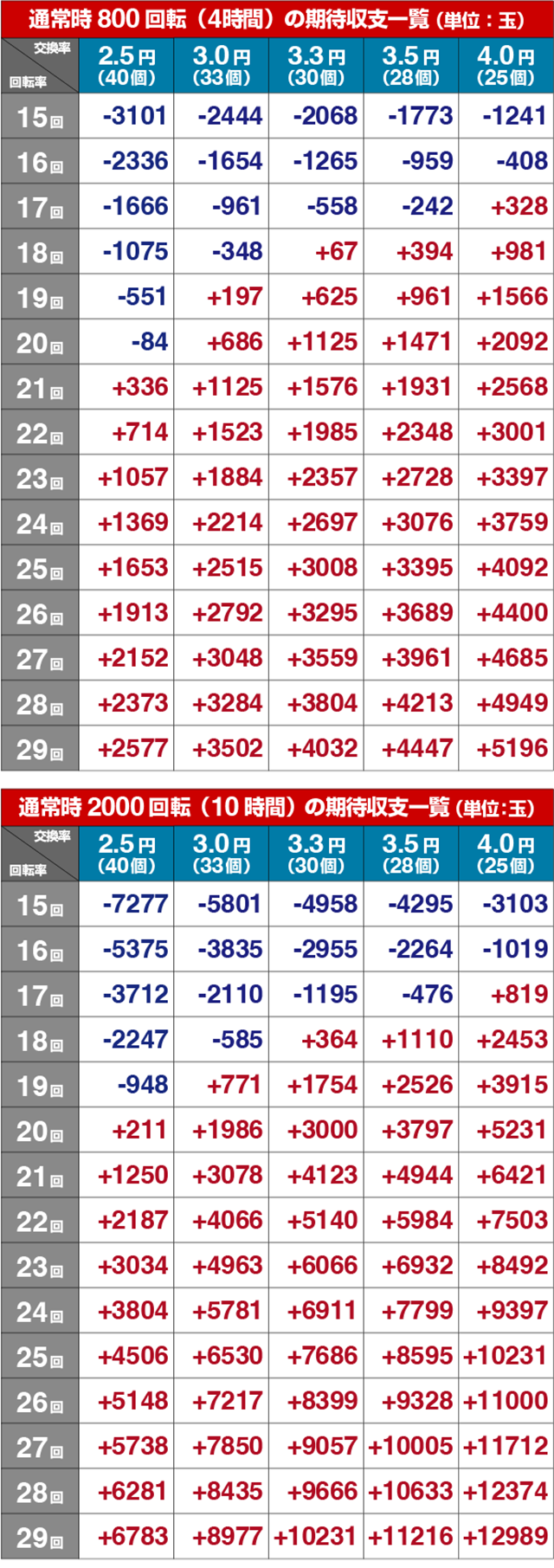 ※回転数あたりのプラス個数は交換後の1玉4円換算での値