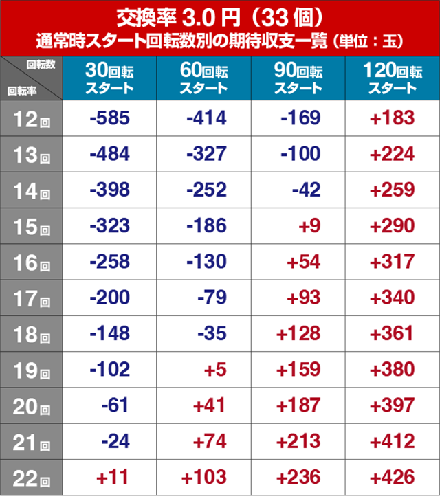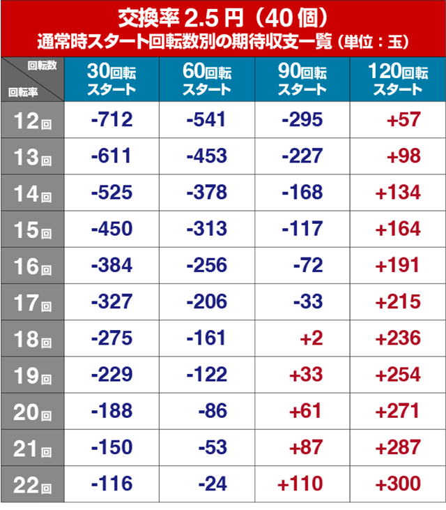 ※回転数あたりのプラス個数は交換後の1玉4円換算での値