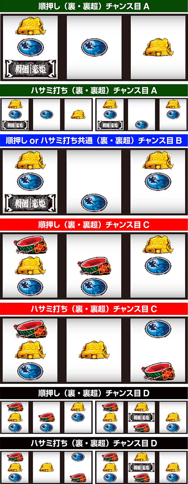 通常時はおもにレア役などを契機にボーナス(AT)当選を目指す、シンプルなゲーム性。 ボーナスはBIGとREGの2種類があり、REGは約100枚を獲得できる。BIGには技術介入要素「姫くり」が存在し、狙えナビ発生時に逆押しで左リールに3連7を停止させるとパネルが開放。2〜8枚のパネルを開放するとナビ回数を獲得するので、獲得枚数がアップする仕組みだ。通常の「姫くり」だと約350枚獲得、BIG当選時の一部で突入する「SUPER姫くり」なら、約450枚と多くなっている。BIG中・REG中ともに、BIGストック抽選も存在する。※コンプリート機能搭載機 |