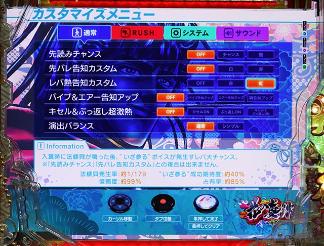 諸々の丁寧な作りに感動して花の慶次全く興味無かったんですが初打ち。いたる所の配慮とアイデアが素晴らしい。 まずカスタムの細かさと見やすさ、特に占有率などの記載とサウンドの個別設定、曲や映像と演出の質が良いから上手く設定した時の没入感が凄い。カスタム結構量あるのにごちゃごちゃしてないし欄変えたら違う絵が出てくるとか地味に嬉しい そもそも慶次は古臭さで嫌厭してたんですが筐体やuiが一新されて曲もOxTさんを起用したりちゃんと新しく人を入れようとしてる努力が見える。筐体については下部が水平になってて物置けるのが良い、あとスマホ置ける突起があるし、球ストッパーが個別にあるし、手置ける台あるし、カウンターのネオンも光り方上品で良い、、、よく見たら文字にラメ入ってるし 倍書きたいけどこの辺で、結局当分母で当たらずやめたけど遊戯台なんだからスペックだけじゃなくてこういうちゃんと作られてる台が評価さ