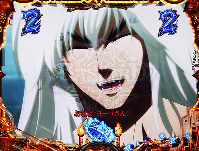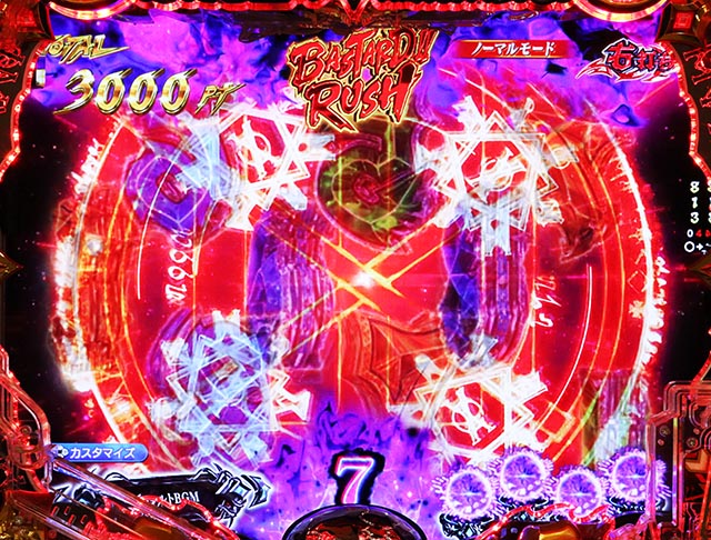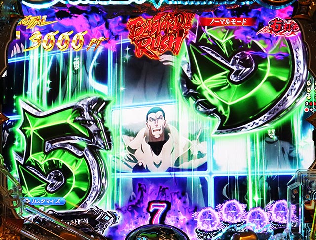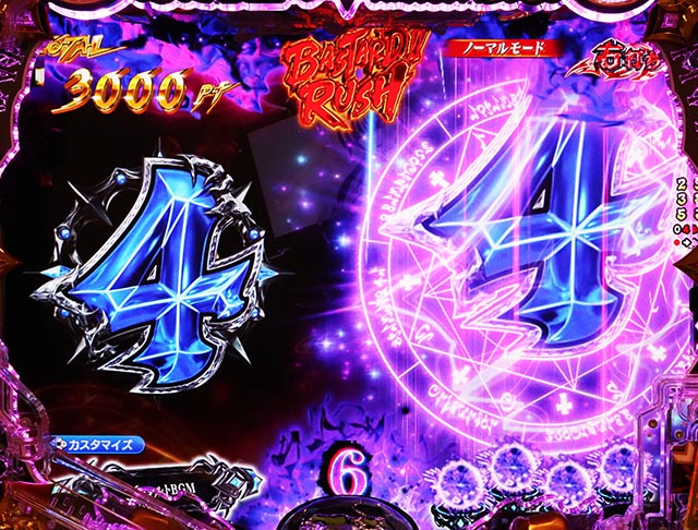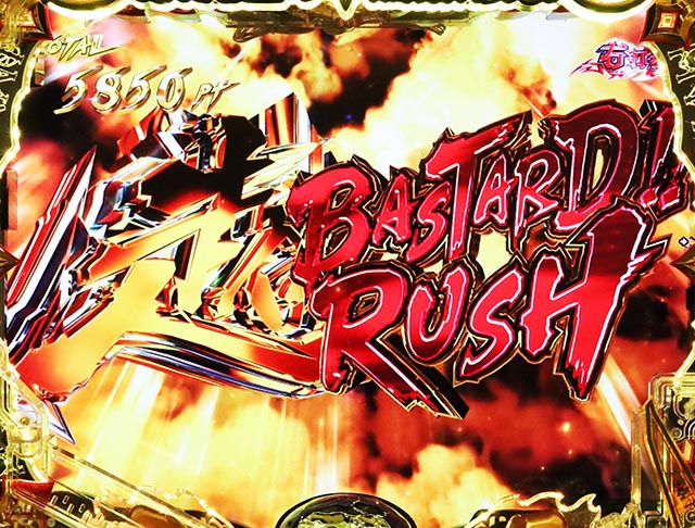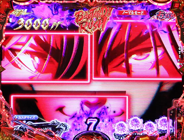 バスタードRUSH中は、幸福絶頂で保留連を告知(内部的に3000BONUSだった場合は保留内で当たらないことがある)。
