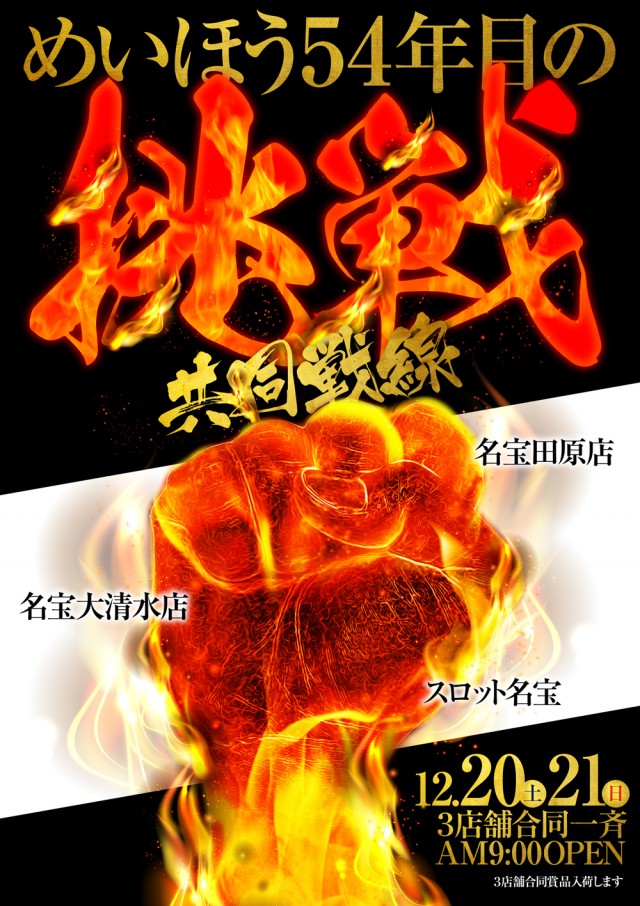 54年目の挑戦 12月20日(土)~21日(土)スロット名宝 名宝田原店 名宝大清水 共同戦線