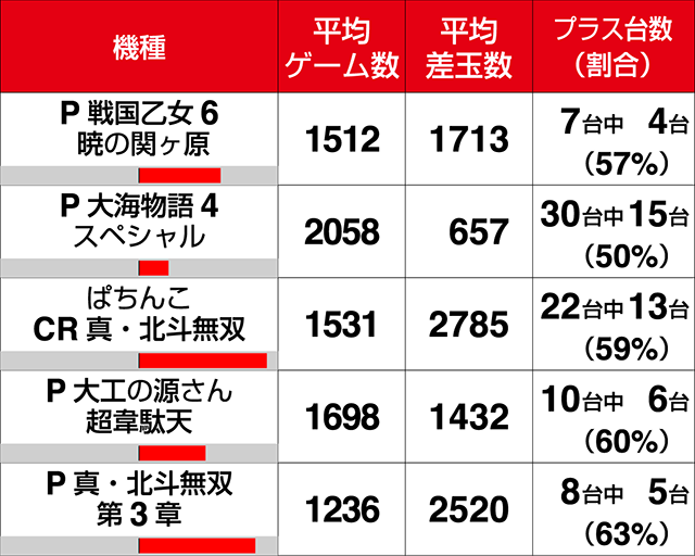 『P真・北斗無双 第3章』や『P大工の源さん 超韋駄天』なども、半数以上の台がプラスを記録した。
