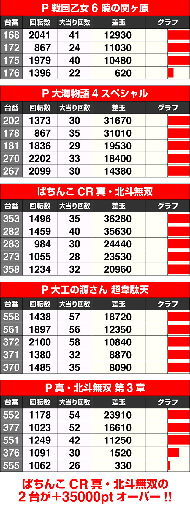 『ぱちんこCR真・北斗無双』は5台が+20000ptを上回り、2台が+35000ptオーバー。