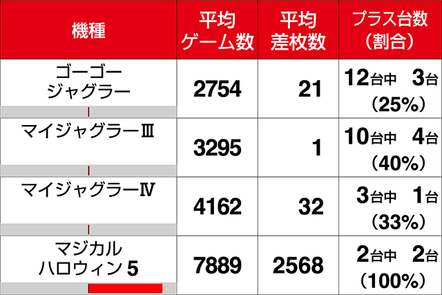 『マジカルハロウィン5』は設置されている2台がともにプラスで、平均差枚数は+2500ptを超えた。