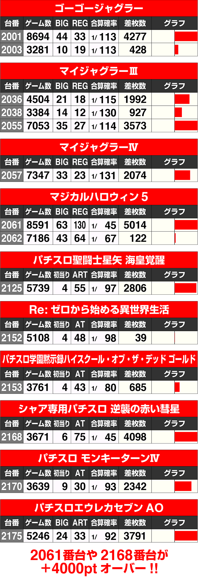 2168番台の『シャア専用パチスロ 逆襲の赤い彗星』は+4000pt超。2061番台の『マジカルハロウィン5』は、+5000ptオーバーであった。
