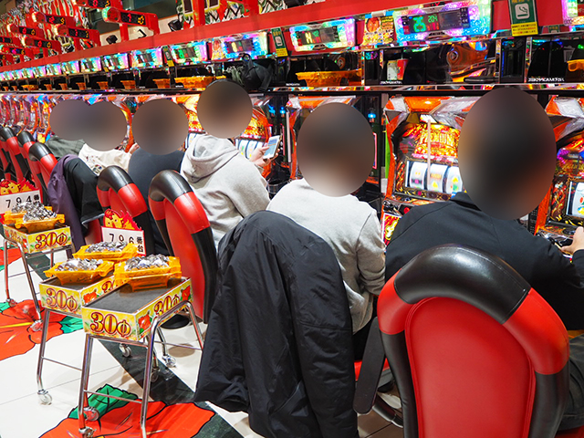 5台がズラリと並んで後ろ積みを量産した『ハナハナ鳳凰-30』は見事な盛り上がり! 最光取材NEXTをしっかりと意識した若年層のプレイヤーが最も盛り上がった光景を演出していた。
